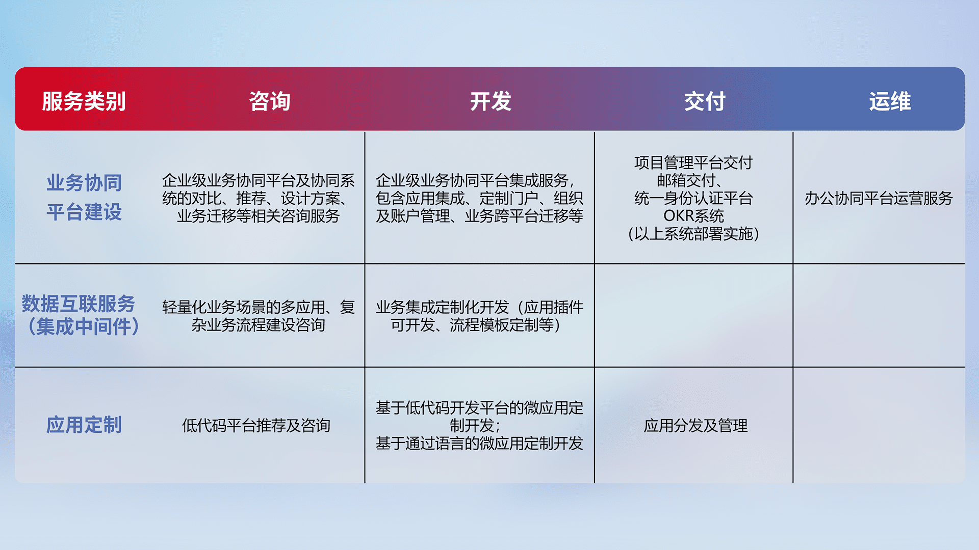 针对钉钉、、、、企微、、、、IDaas等平台级产品提供产品的规划、、、、方案、、、、交付、、、、定制化开发等服务,,实现如统一协同办公、、、、智能客户服务、、、混合会议管理、、、、智能数据查询、、等业务场景,,,,实现数字化转型。。。
