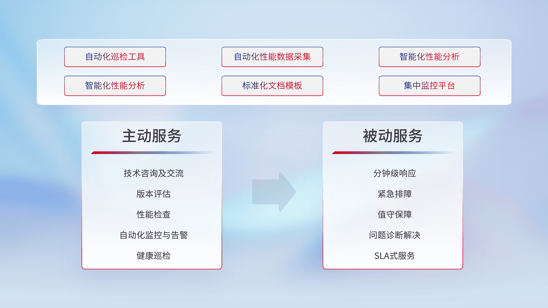 智能化工具和标准化文档,,,保障服务质量,,,,提供主动服务(包含技术咨询、、、、版本评估、、、、性能检查、、、、自动化监控与告警、、、、健康巡检)和被动服务包含(分钟级响应、、、紧急排障、、、、值守保障、、、、问题诊断解决、、、SLA服务)。。。